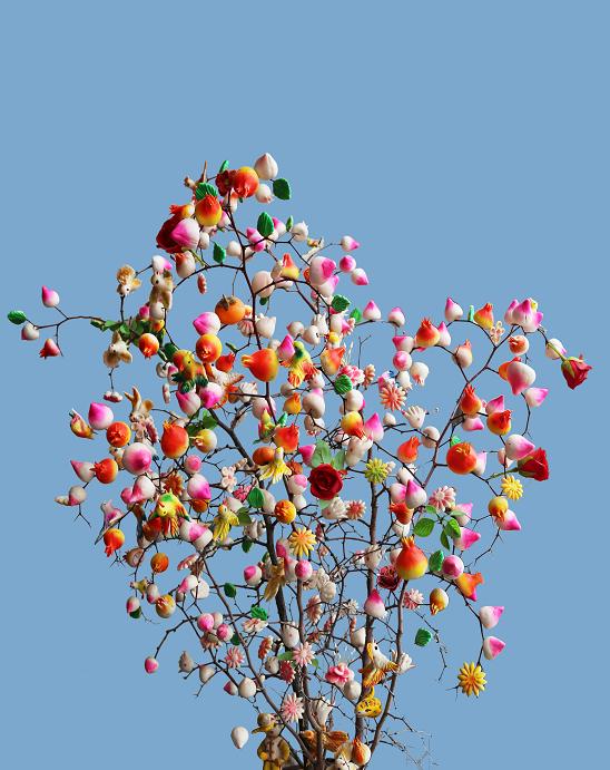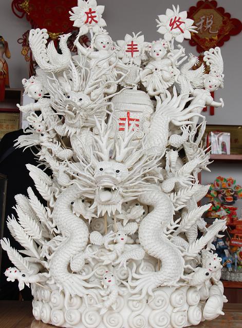 岚县面塑作品中,有象征六畜兴旺的猪、牛、羊、马、兔、狗等,有象征喜庆吉祥的狮子、老虎、龙、凤、蛇盘兔等,有象征婚喜长寿的花馍、寿桃、鱼、爬孩孩、罗汉汉等,有再现历史故事、神话人物的“观音像”“财神爷”“老寿星儿”“八仙过海”“二龙戏珠”“孙悟空”等等。这些形态各异、惟妙惟肖的面塑作品,涵盖了岚县面塑常见的表现内容。随着人们思维视野的拓宽和现实需求的变化,岚县面塑作品除了保留传统的题材之外,年轻一代的艺人们还在面塑作品中增加具有时代性、创新性的内容,给面塑作品创造了更多的可能性和实用性。