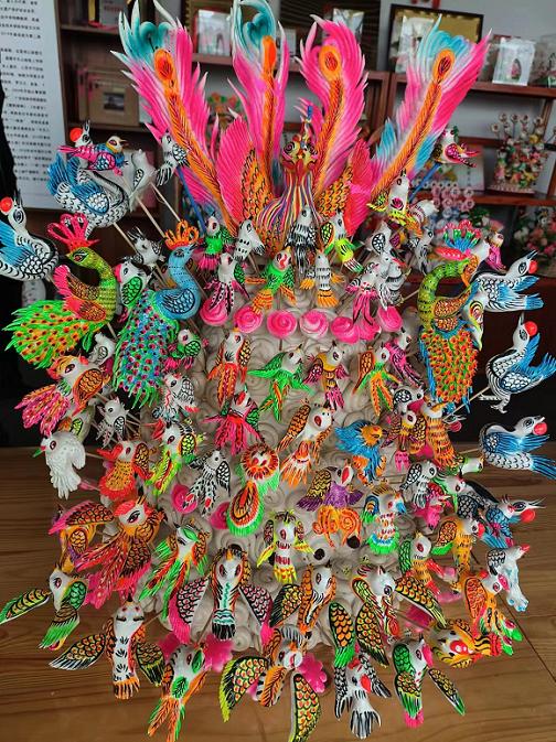 岚县面塑历史悠久、文脉深远,迄今已有一千多年的历史,其以德孝文化为主旨形成了祈福、载道和展陈三大门类,寄托了黄河流域农耕文明以来的朴素理想,弘扬了人民群众对真善美的追求,2014年入选国家级非物质文化遗产保护名录。近年来,岚县通过手工作坊与乡村扶贫产业相结合,形成全国唯一一个集非遗传承示范、文化旅游体验、特色产业带动,集研发、推广、销售为一体的“非遗文化产业集群”。岚县面塑作品造型简洁,浑厚中凸显粗犷,朴实典雅里透着精巧艳丽。外形上一般是整洁、概括,内涵饱满丰富,既有几何直线形式,又有饱含秦汉遗风的纹样。所塑人物神采奕奕、栩栩如生,着重夸大头部比例,刻画四肢的灵活,使人感到神似形美。飞禽类则夸张地表现其尾部动感,夸大嘴部、腿部,使其具有拟人的效果,与观赏者在感情上产生强烈共鸣。