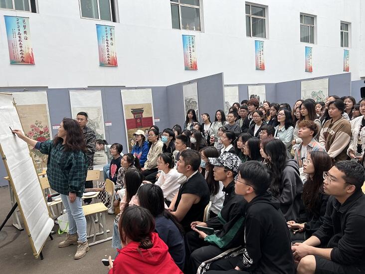 2023年5月31日下午,中国美术家协会会员、广东省美术家协会理事、广州画院特聘画家郑国伟先生和中国美术家协会会员、山西省美术家协会会员、太原画院特聘画家郭兰英女士来到betway88西汉姆进行学术交流与示范教学,为betway88西汉姆师生带来一场别开生面的艺术盛宴。现场秩序井然,气氛热烈。郭兰英老师热情挥毫落墨,郑国伟老师现身说法,热情洋溢,真可谓珠联璧合,展示出二位老师非凡的艺术修养与理论造诣。示范教学结束后,二位老师与betway88西汉姆美术专业教师进行了学术交流,二位谈古论今,以当代视野审视传统,并结合时代精神,以习近平主席二十大讲话精神为导向,给老师们上了一节生动的艺术创作课。与此同时,郑国伟老师与郭兰英老师双双被聘为betway88西汉姆客座教授,系主任张云奇为二位老师颁发了聘书。至此,整个学术交流与示范教学活动圆满落幕。