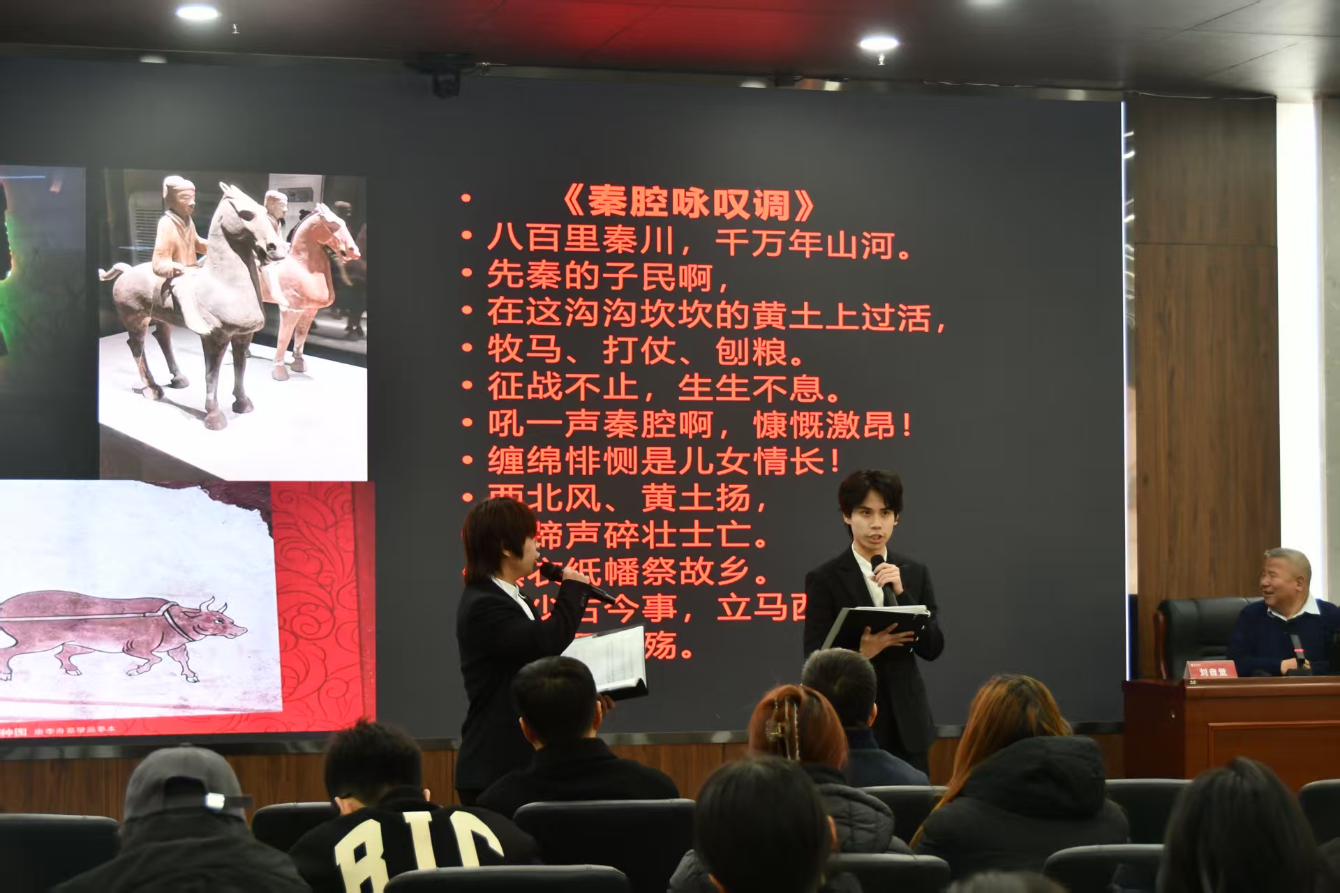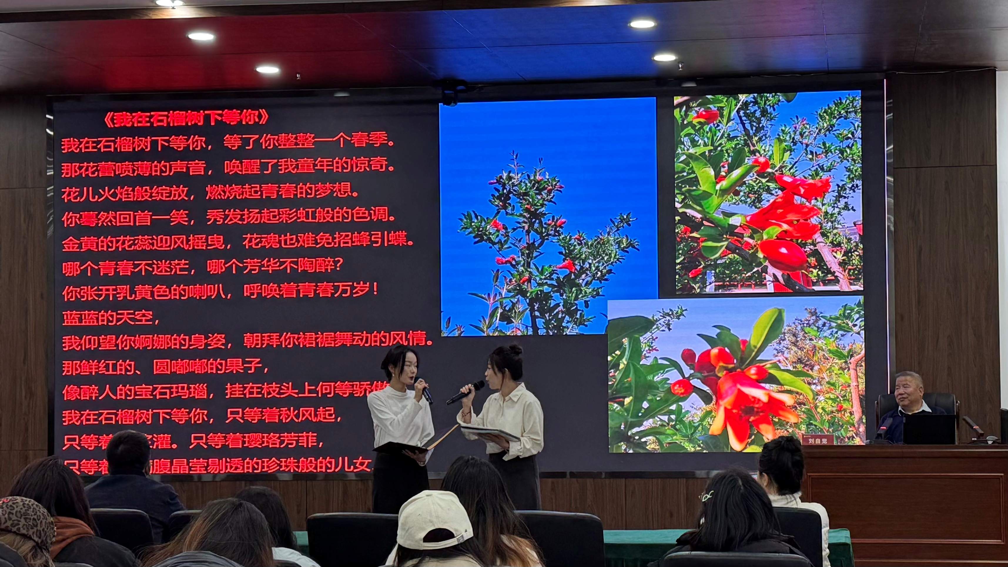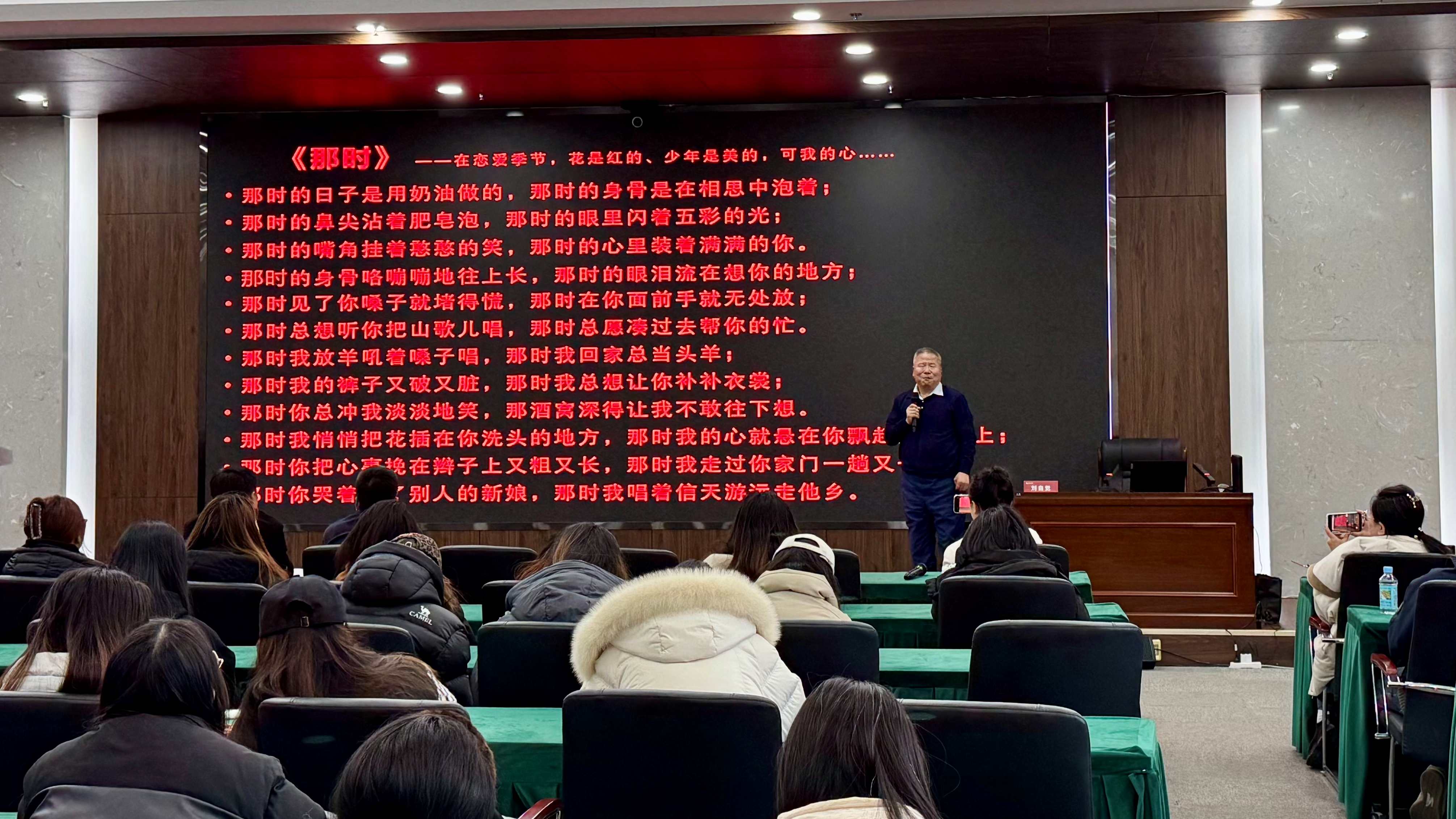讲座中,刘自觉教授以个人创作经历为脉络,将学术解读与作品赏析深度融合,系统阐释不同时期诗作的文化内核与情感肌理,为师生搭建起“诗”与“乐”的对话桥梁。在作品分享环节,《秦腔咏叹调》以童年音乐记忆为底色,生动勾勒西北人民的生活图景,经betway88西汉姆学生深情朗诵,将地域文化的厚重感传递至现场每一位听众;《我在石榴树下等你》等青年时期佳作,借学生朗诵的细腻表达,让青春情愫与生活温度跃然眼前。