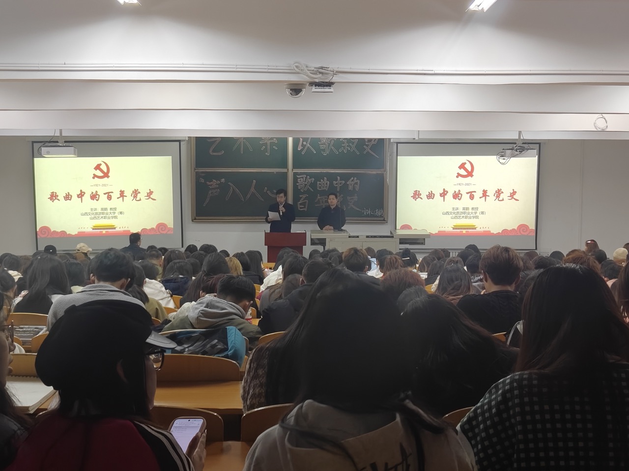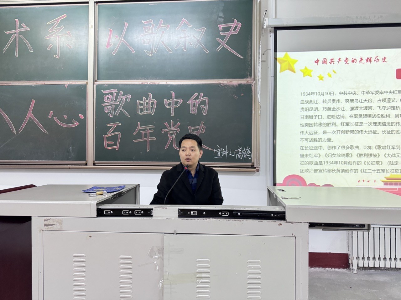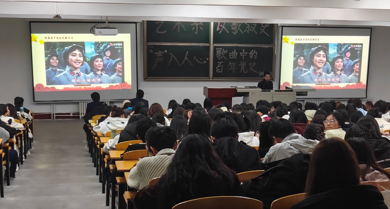 高鹤教授近年来潜心于红色音乐的研究与传播,取得丰硕成果。本次讲座从歌曲创作的内容、旋律与时代背景讲起,紧紧结合革命和建设,从建党的开天辟地,到新中国成立的改天换地,再到改革开放的翻天覆地……从音乐中重温党史,感受中国共产党波澜壮阔的发展历程。讲座在短短的两个小时内梳理出清晰的音乐党史线路图,从听觉到视觉,让同学们感受到中国共产党不屈的百年奋斗史,感悟到信仰的力量,深刻认识到今天幸福生活的来之不易。