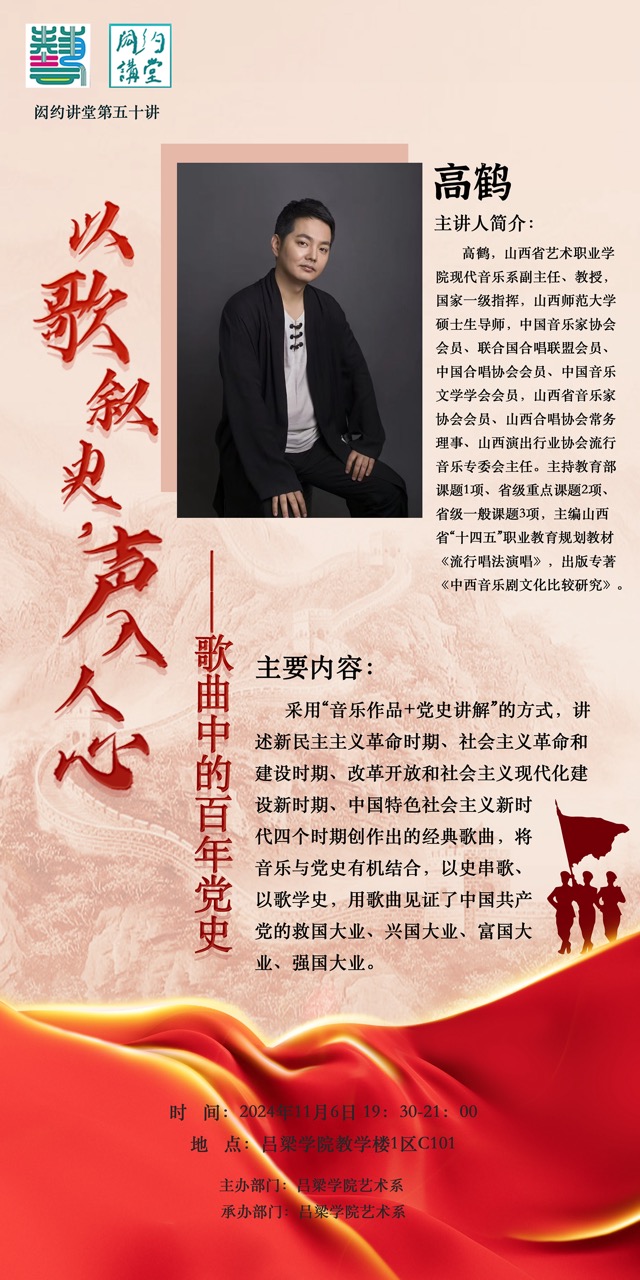 2024年11月6日,betway88西汉姆邀请邀请中国音乐家协会会员、山西省艺术职业学院现代音乐系声乐教授高鹤举办了《以歌叙史,“声”入人心——歌曲中的百年党史》为主题的专题讲座。高鹤教授以时间为轴线,采用“音乐作品+党史讲解”的方式,为betway88西汉姆师生讲述了新民主主义革命时期、社会主义革命和建设时期、改革开放和社会主义现代化建设新时期、中国特色社会主义新时代四个时期创作出的经典歌曲,将音乐与党史有机结合,以史串歌、以歌学史,用歌曲见证了中国共产党的救国大业、兴国大业、富国大业、强国大业。