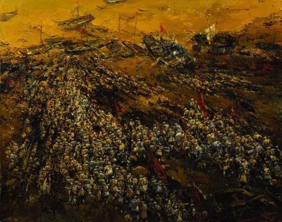 其次,他强调油画创作的选题与表现形式,以自己的两幅作品《黄河激浪》和《北上·北上》为例,强调选题是绘画创作的关键,创作者应关注当下、了解历史,选择有深度的选题。此外,在表现形式上也要不断尝试,根据选题和自己的创作风格来选择适合的表现形式。