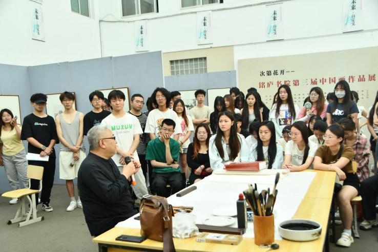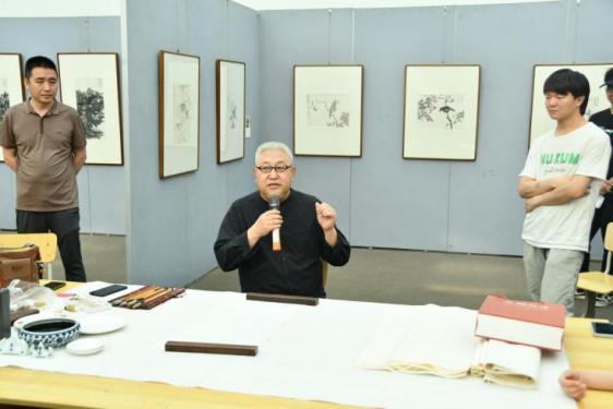 活动现场,李文亮老师先是分享自己的创作经验,并讲解了国画的历史渊源、技法特点和艺术内涵。在讲解的同时,李老师还进行现场创作示范,从线条的勾勒到色彩的晕染,一边作画一边讲解,创作中每一个步骤的技巧和注意事项讲解非常清晰。之后,在场师生和李老师积极互动,解答了关于国画创作与鉴赏的各类问题,并鼓励大家寻师经典,勇于探索。