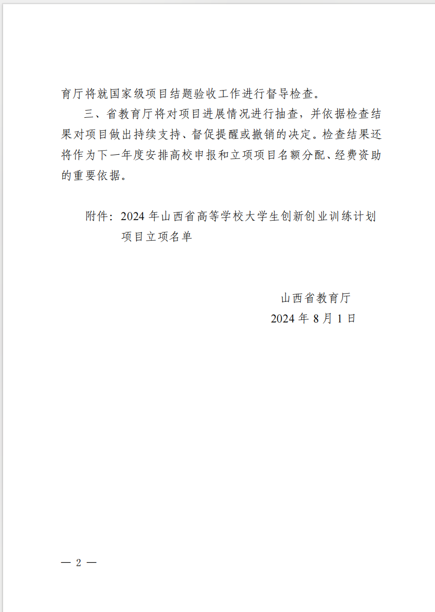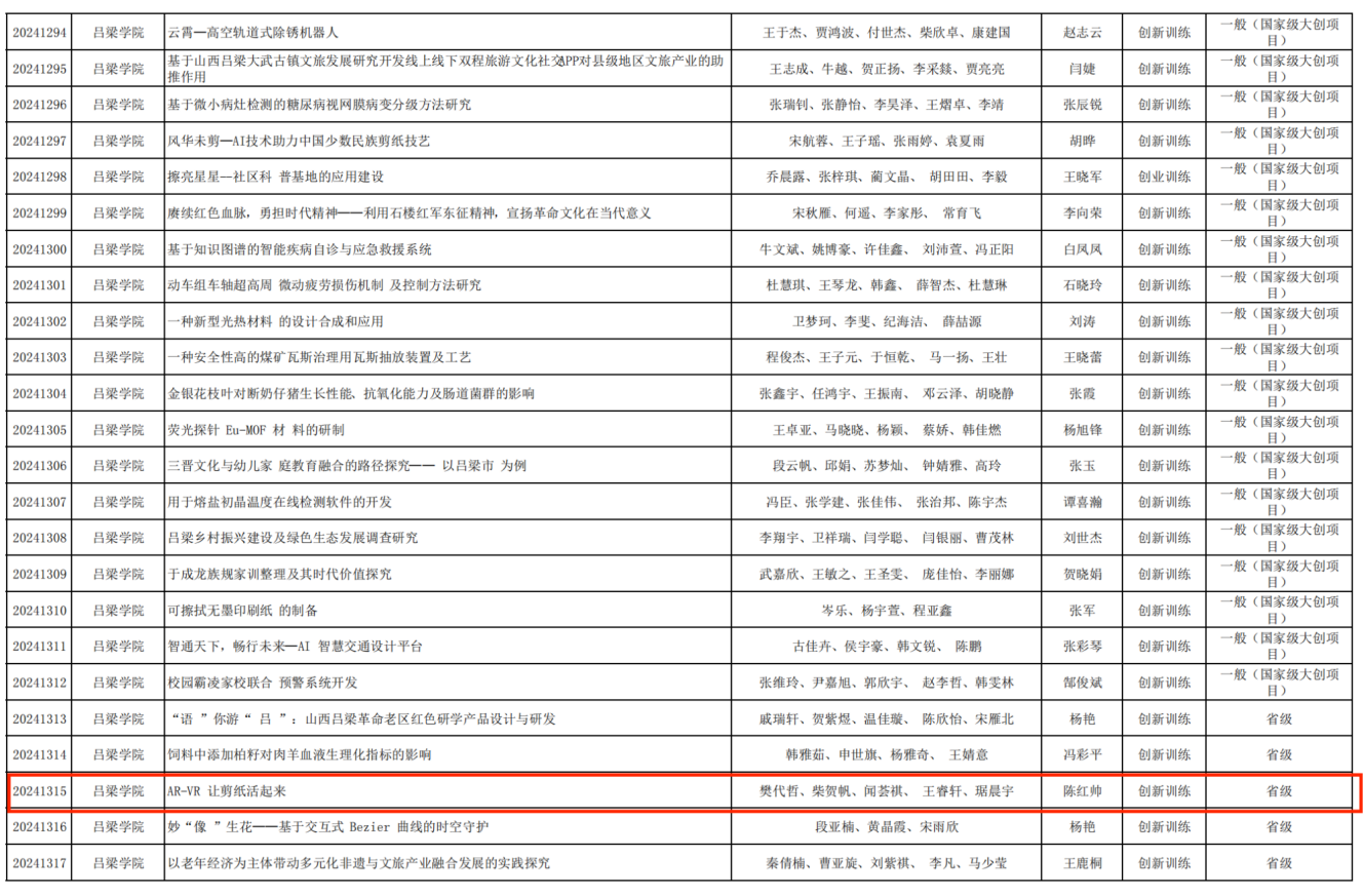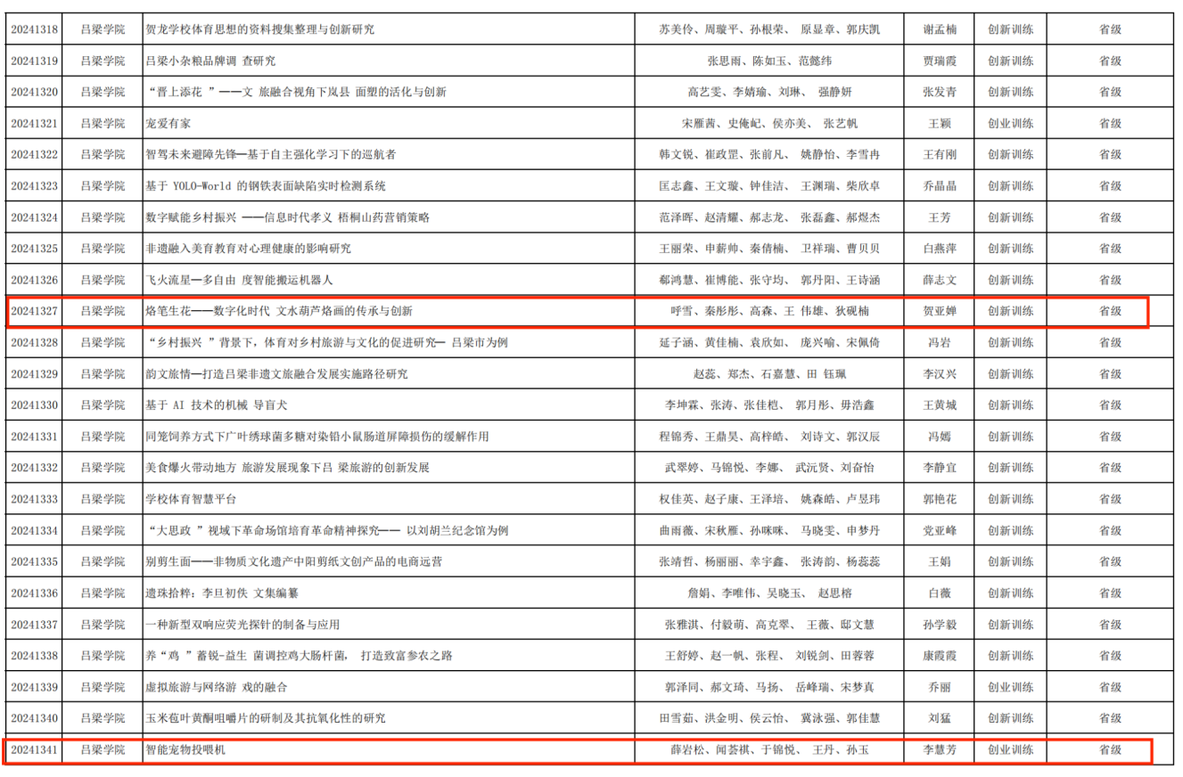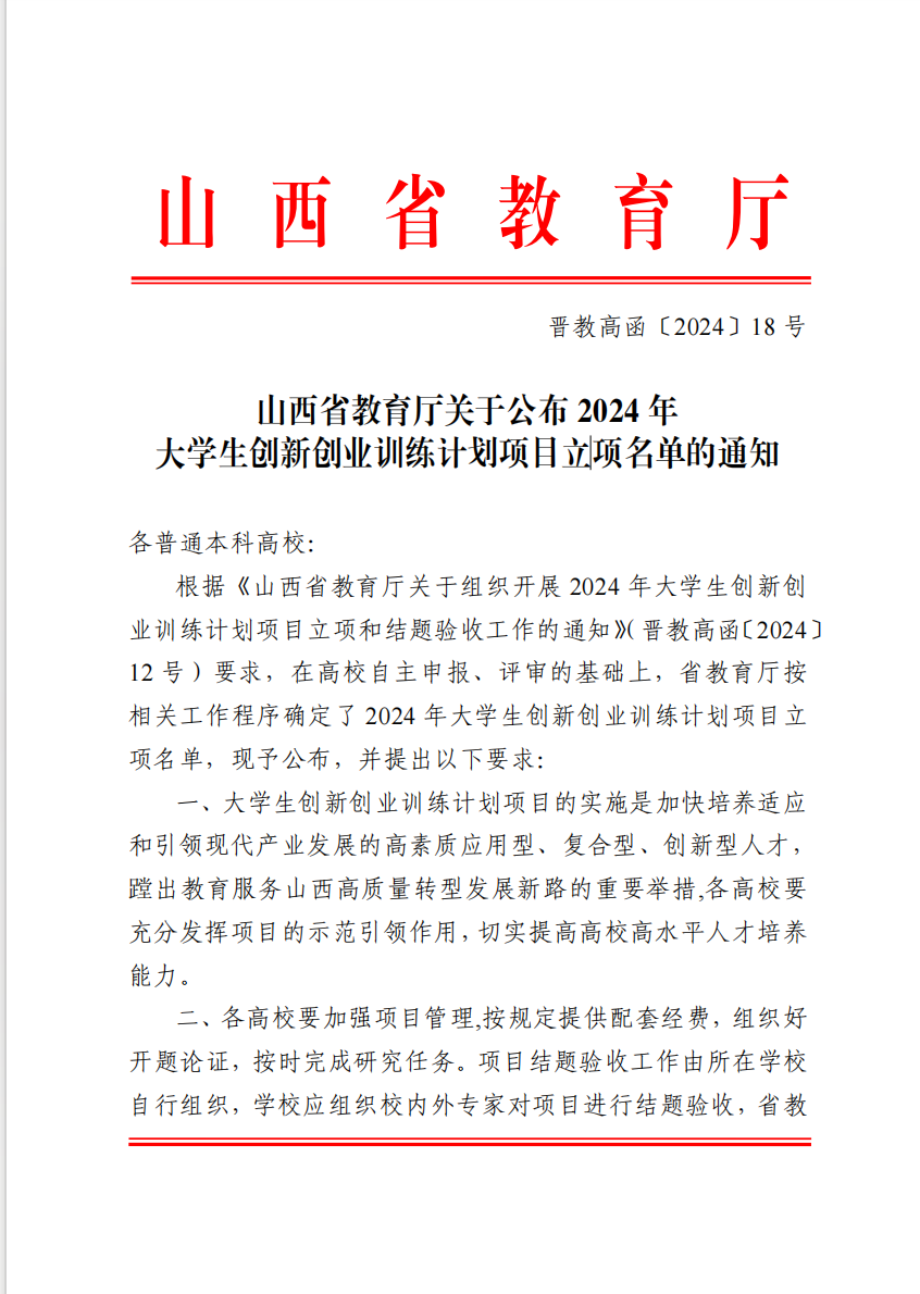 2024年8月1日,根据《山西省教育厅关于公布2024年大学生创新创业训练计划项目立项名单的通知》 (晋教高 〔2024〕18 号)文件要求,我系高度重视,积极组织学生进行申报,经学生团队申报、学校组织专家评审,省教育厅审核,最终我系陈红帅、贺亚婵、李慧芳三名老师指导的2024年大学生创新创业训练计划,获批省级立项3项。