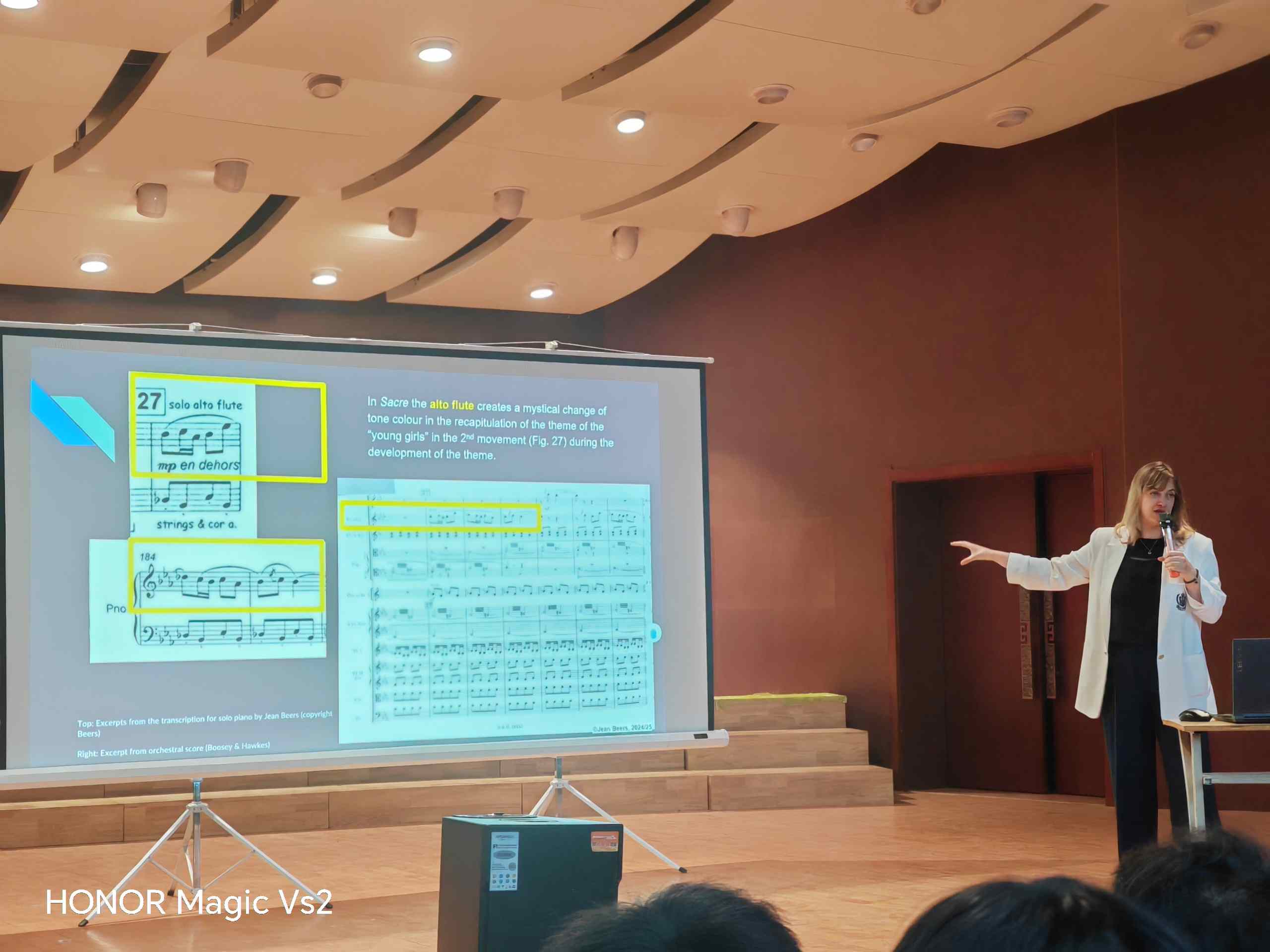 Jean Beers教授以斯特拉文斯基的芭蕾舞音乐《春之祭》作为案例研究,结合自身改编的《春之祭》钢琴版本,开展专题《改编是如何运作的》的讲座Jean Beers教授的钢琴版本被评价为“技艺要求极高”表演艺术课上,教授演奏了作品中几个富有标志性的片段,仔细描述了其在管弦乐《春之祭》原作基础上,如何通过解构、分析、运用密集的和弦、快速音群特殊的踏板运用,以及模拟管弦乐的轰鸣效果,同时保留原作标志性的节奏来创作全新的钢琴作品《春之祭》的过程,为现场观众留下了极为深刻的印象
