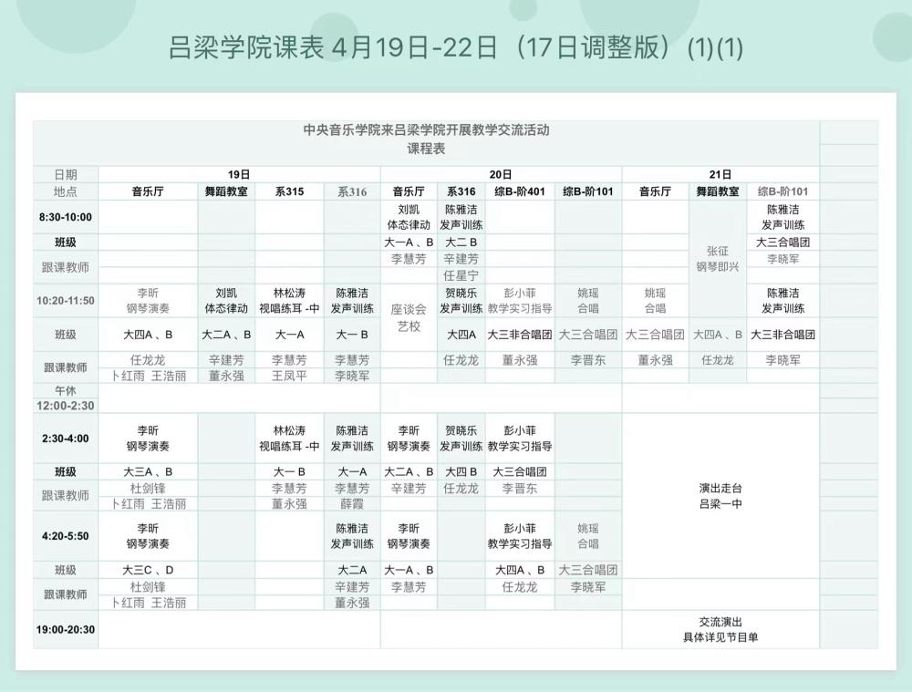 说明:为切实落实学校教师从教能力和人才培养工作水平“双提升”,我校特邀请中央音乐学院音乐教育学院9位知名教授于4月19—21日莅临我校亲自授课,为我们作课堂示范,机会宝贵,千载难逢。betway88西汉姆对近日课程做了整体调整,请音乐学专业全体老师、同学积极参加,心无旁骛、全神贯注学习聆听。