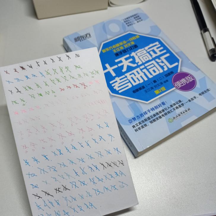 我的英语是开始的最早的,因为知道自己欠了账,英语大学之后就没好好学过了。所以在三月底四月初的样子就开始每天背单词,用的书是王江涛的《十天搞定考研词汇》乱序版。书里有二维码,可以下载app扫描出来有免费的音频,按单元录的,每天早上学习之前我都喜欢跟读两个单元。书里一共分了二十个单元,每个单元有十单页,大概140个单词左右。每两个单元划分为一天的话,这样十天就能过一遍。但是我太有自知之明了,所以我选择了最初二十天过一遍。这样每天的任务就是一个单元。就这样我也是每天从早坐在桌子前对着单词本从早到晚上,尽管是你只要能看到英文反应的出来中文就好了。后来渐渐地我能一个上午就记完一个单元,再后来三个小时。