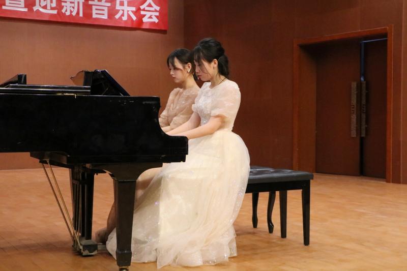 钢琴作品中,郭洪涛老师和她的四个学生,分别演奏了四手联弹和双钢琴八手联弹作品《在希望的田野上》《我和我的祖国》。同时郭老师还担任本场音乐会主持工作,展现了我系教师良好的综合素质。
