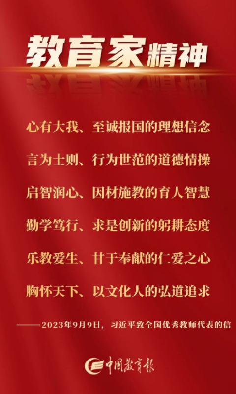 长期以来,以你们为代表的全国广大教师认真贯彻党的教育方针,教书育人、培根铸魂,培养了一代又一代德智体美劳全面发展的社会主义建设者和接班人,造就了大批可堪大用、能担重任的栋梁之才,为国家发展、民族振兴作出了重要贡献。教师群体中涌现出一批教育家和优秀教师,他们具有心有大我、至诚报国的理想信念,言为士则、行为世范的道德情操,启智润心、因材施教的育人智慧,勤学笃行、求是创新的躬耕态度,乐教爱生、甘于奉献的仁爱之心,胸怀天下、以文化人的弘道追求,展现了中国特有的教育家精神。