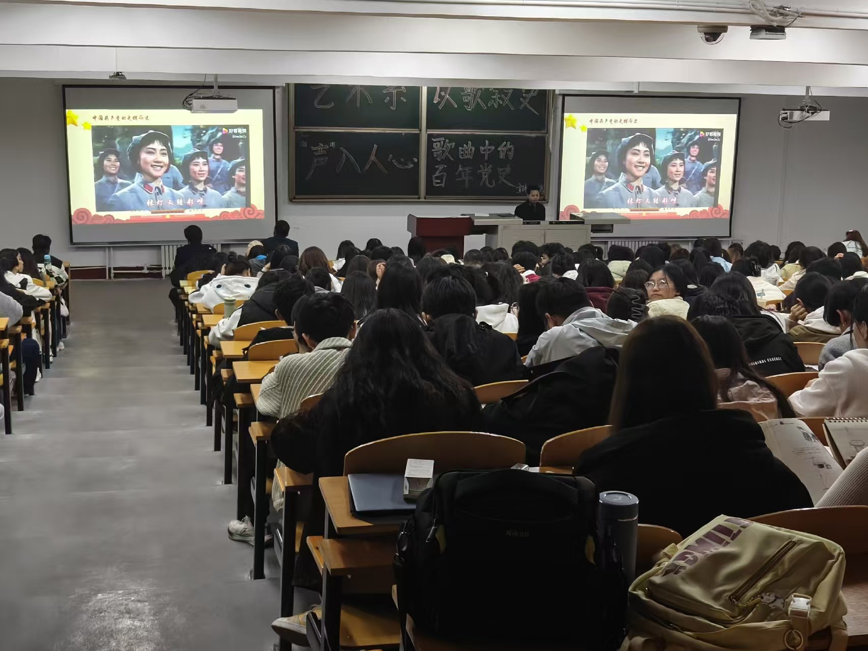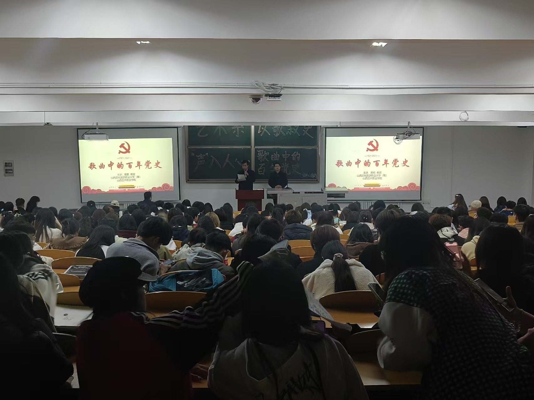 高鹤教授近年来潜心于红色音乐的研究与传播,取得了丰硕成果。本次讲座从歌曲创作的内容、旋律与时代背景讲起,紧紧结合革命和建设,从建党的开天辟地,到新中国成立的改天换地,再到改革开放的翻天覆地……从音乐中重温党史,感受中国共产党波澜壮阔的发展历程。讲座在短短的两个小时内梳理出清晰的音乐党史线路图,从听觉到视觉,让同学们感受到中国共产党不屈的百年奋斗史,感悟到信仰的力量,深刻认识到幸福生活的来之不易。