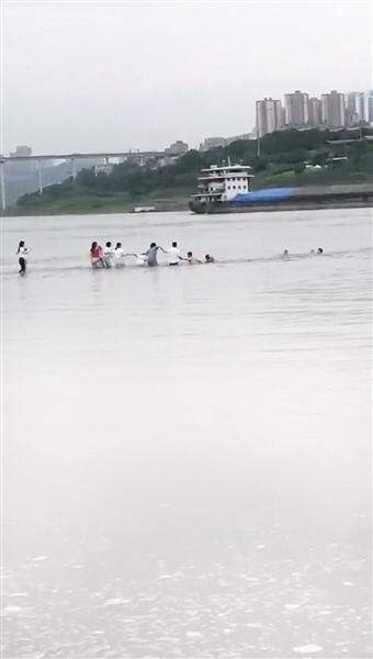 哪怕是明显感受到巨大危险,但江滩上前一刻还在嬉闹的人群,竟然在不到2分钟内,组成了十几人、长达二三十米的“人链”。